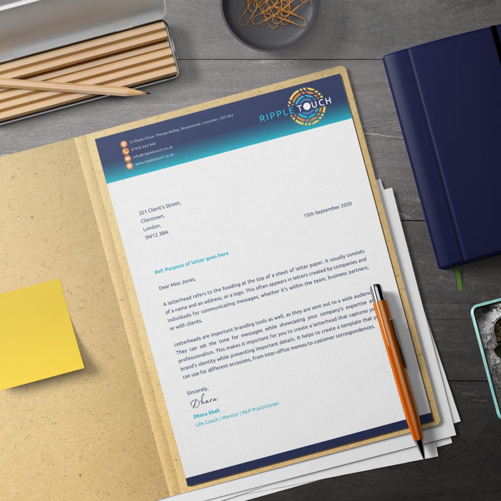 The logo concept was inspired by my client’s transformational work and the impact this has Ripple Touch’s clients personally and throughout their lives. This was symbolised by a ripple effect in water.