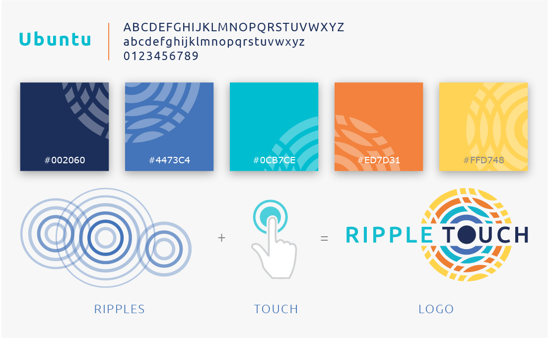 I selected a modern, friendly, versatile yet professional sans-serif typeface Ubuntu for the Ripple Touch brand. It is used in bold, uppercase and light styles for digital and printed assets.